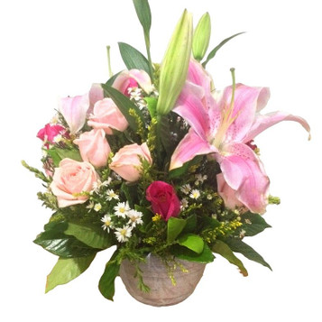 Dozen Roses with Stargazer lilies in a terracotta vase.