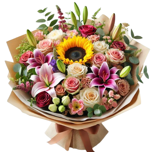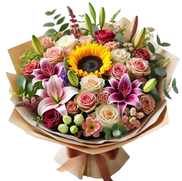 Assorted Premium Bouquet is made up of roses, lilies and a sunflower.