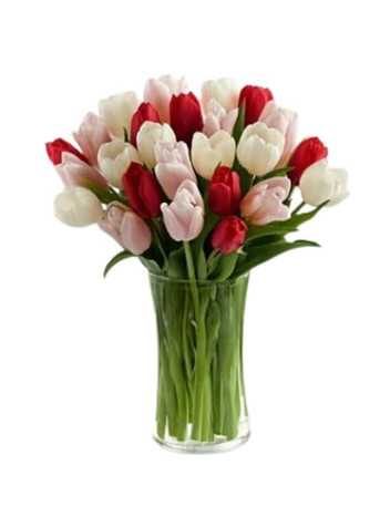 Bouquet made up of white, pink and red tulips imported from Holland.