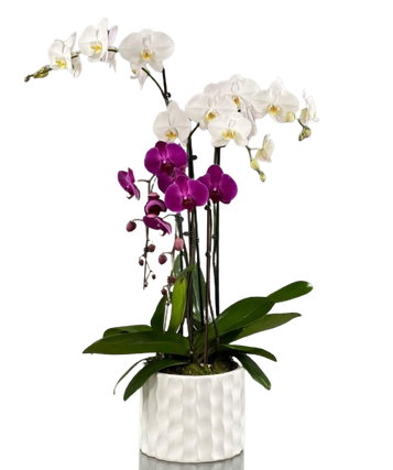 White and Violet Phalaenopsis Orchids Arrangement, our most precious orchid Beauty made up of three (3) white stems, and one (1) violet stem.