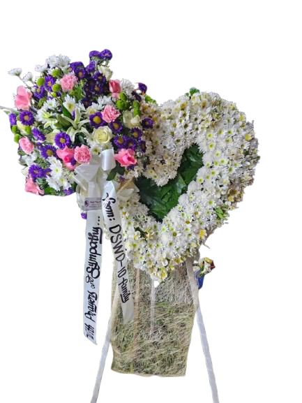 To complement the serene white heart, a vibrant cluster of pink, purple, and soft green blooms adds warmth and tenderness—representing gratitude, remembrance, and deep affection. This elegant blend creates a meaningful display that brings comfort and solace to grieving families during wakes, funerals, and memorial services.